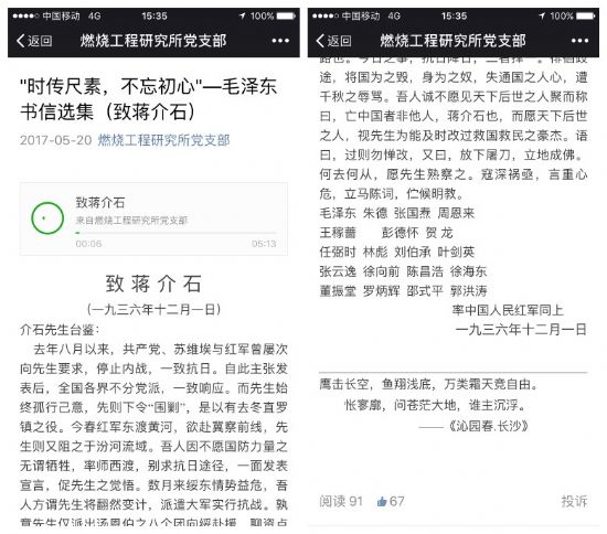 推送内容确定以后,在党内征集了两位志愿党员,以朗读的形式录制了毛泽东同志的书信手稿翻本。用这种极具渲染力的方式,借助文字和声音的力量,传递出毛泽东同志对待教育的观点看法以及为求国共两党联合抗日时所表露出的真知灼见。