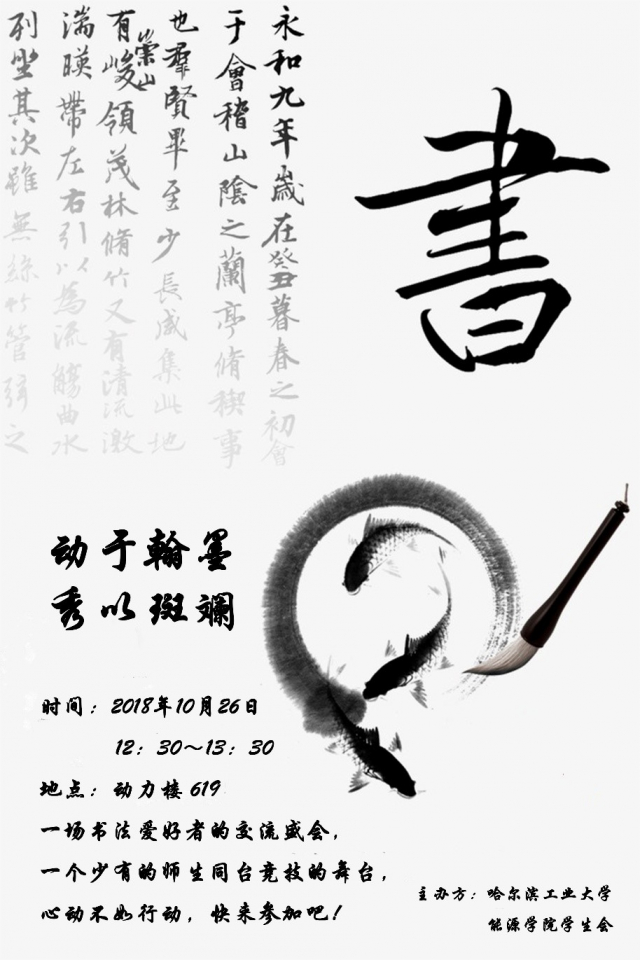学生会现面向全体师生举办“动于翰墨·秀以斑斓”活动。活动邀请名师为大家进行指导,参与者可现场创作(现场提供笔墨纸砚,对笔墨有要求者可自备),作品当场展出,获奖者可获得精美礼品一份。