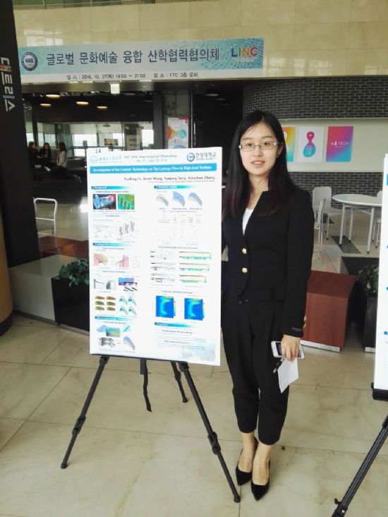 学习成绩上有了一定的提高后,对科技创新充满好奇和向往的她开始组队参加创新创业项目、节能减排大赛开启了自己的科创之旅,进入实验室和老师、师兄多多沟通、阅读查找大量中外文献,从最初好奇性的接触、到期间探索性的学习,再到最后加工成品参加比赛。这期间方案讨论、模型搭建、数据分析、论文修改,每一个过程听起来是那么的简单,水到渠成般轻松。但科研的路走过的人都知道,不是那么的容易与简单,在风雨中砥砺前行成为那时候她的口头禅。有时一个数据和模拟结果的偏差都会让她们反复进行实验和模拟很多次,因为科研的时间太晚,被宿舍管理员教育都是再平常不过的事了。也正是备战期间她和队友们夜以继日的奋斗和较真不服输的精神让她们顺通过初赛和网评,最后在决赛中获得一等奖,并于2016年8月受邀赴台湾参加东元国际科技大赛进行交流,10月随学院赴韩国汉阳大学参加学术交流和海报展示。一次次的比赛与交流让她开拓了视野,锻炼了口语表达能力,同时也更加明确了今后前进的方向。