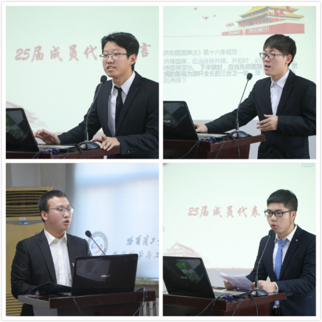接下来第24,25届国旗护卫队成员代表分别进行了发言。巩长江同学代表老一届成员向学弟们传递自己在过去一年的升旗任务中,所积攒的经验教训与感悟,“国旗班是一个靠着信仰的组织”,国旗班靠着这份信仰走过了二十多载春秋,也希望新成员们继往开来,将其发扬光大。随后尤志凯同学代表新一届队员们,在此坚定的表示,经过三个月的实践与训练,新一届国旗护卫队已有能力,有信心接过学长手中的旗帜,从此用自己的行动与信念捍卫国旗的尊严。而后,25届成员赵腾同学对有关国旗国歌国旗护卫队的历史,做出了简明精要的分享,帮助大家由内而外的了解国旗,捍卫国旗。