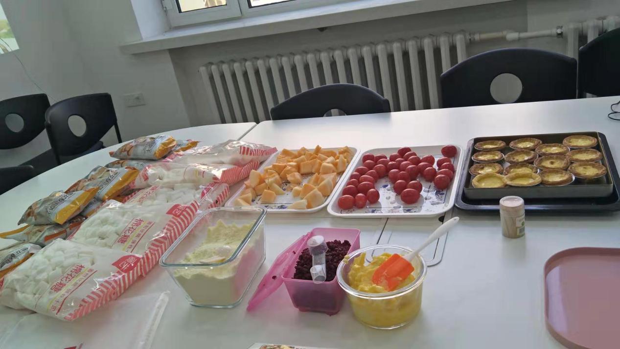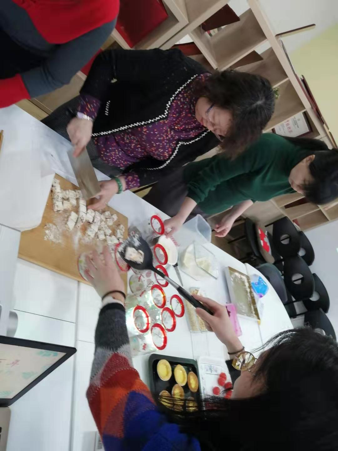 大家齐心协力,提前一天就准备好了黄油、棉花糖、奶粉、饼干碎、蔓越莓干和一些配料等新鲜食材,并号召院内女职工准备一起学习制作。院办张蕊老师精心为每位教职工讲述制作过程,边说边做,从称重、配料、时间等几个方面详细地说明了花生酥奶糖和蛋挞的做法。