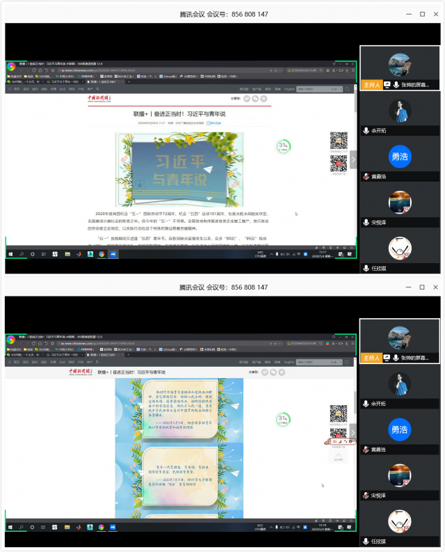 活动借助腾讯会议软件,组织学生干部线上学习央视网《联播+》梳理的习近平总书记对新一代青年的深情寄语,感悟习总书记对青年一代的殷切希望,坚定理想信念,明确奋斗方向。