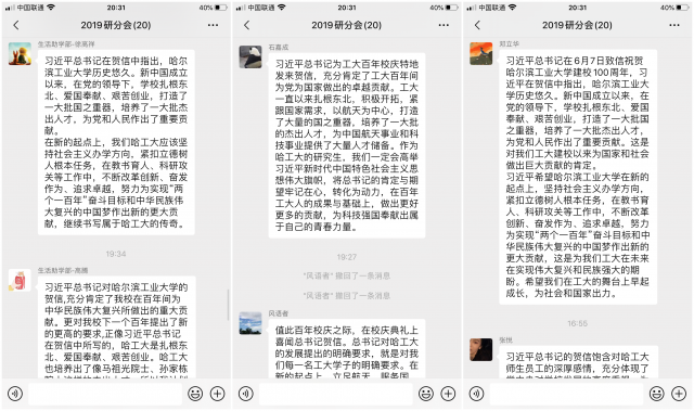 研分会成员郑思远说,值此百年校庆之际,在校庆典礼上喜闻总书记贺信。总书记对哈工大的发展提出的明确要求,就是对我们每一名工大学子的明确要求。在新的起点上,立足航天,服务国防,面向国民经济主战场,不断改革创新,奋发向上。一代又一代的工大学子在历史和时代的洪流中,选择了将个人发展与祖国命运紧密相连的发展道路。用自身严谨朴实的哈工大规格和扎实牢靠的哈工大功夫献身这个伟大的时代。我们要把在哈工大学习生活中的点滴积累凝炼筑牢,主动将自己事业发展融入国家发展道路。