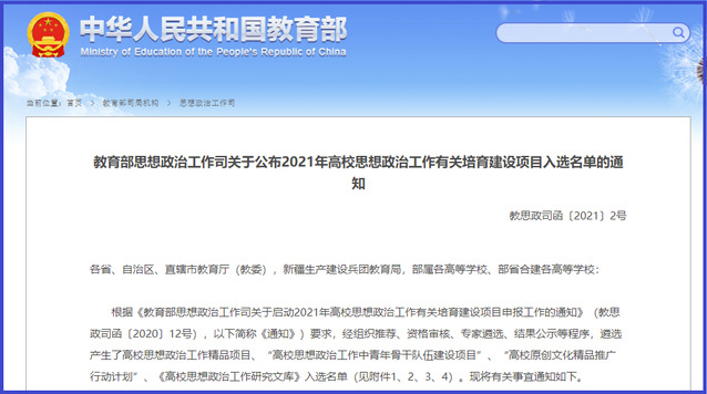 据《教育部思想政治工作司关于启动2021年高校思想政治工作有关培育建设项目申报工作的通知》(教思政司函〔2020〕12号),经组织推荐、资格审核、专家遴选、结果公示等程序,遴选产生了高校思想政治工作精品项目100项,中文字幕av 入选1项。