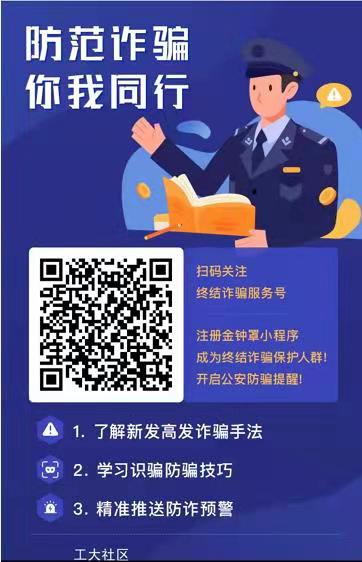 七、注意财产安全,警惕网络诈骗、信贷陷阱等事件,建议学生扫描文末二维码注册金钟罩小程序。